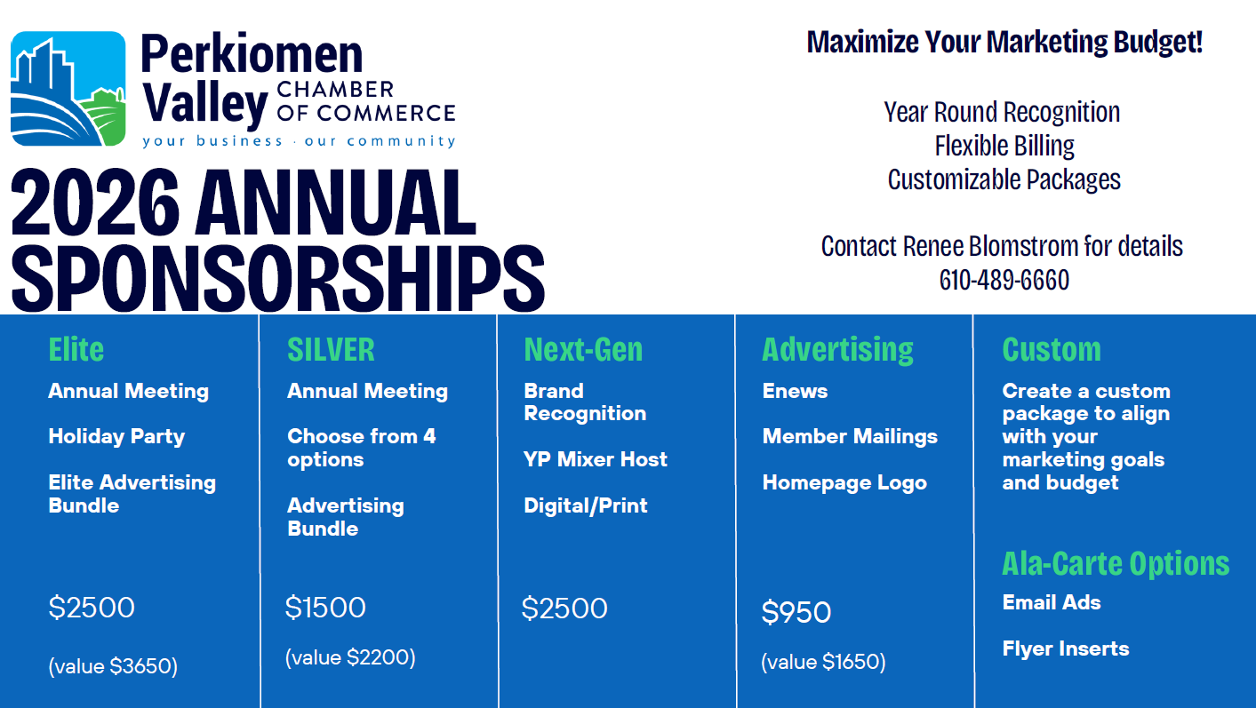 Opportunities are filling quickly! Contact us with any questions or to create a custom package. Call 610-489-6660 or Email info@pvchamber.net