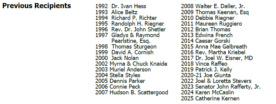 * Criteria for Nomination: An individual whose long-term efforts and involvement have made a significant, positive impact upon life in the Perkiomen Valley community. (Does not have to be a member of PVCC.)
