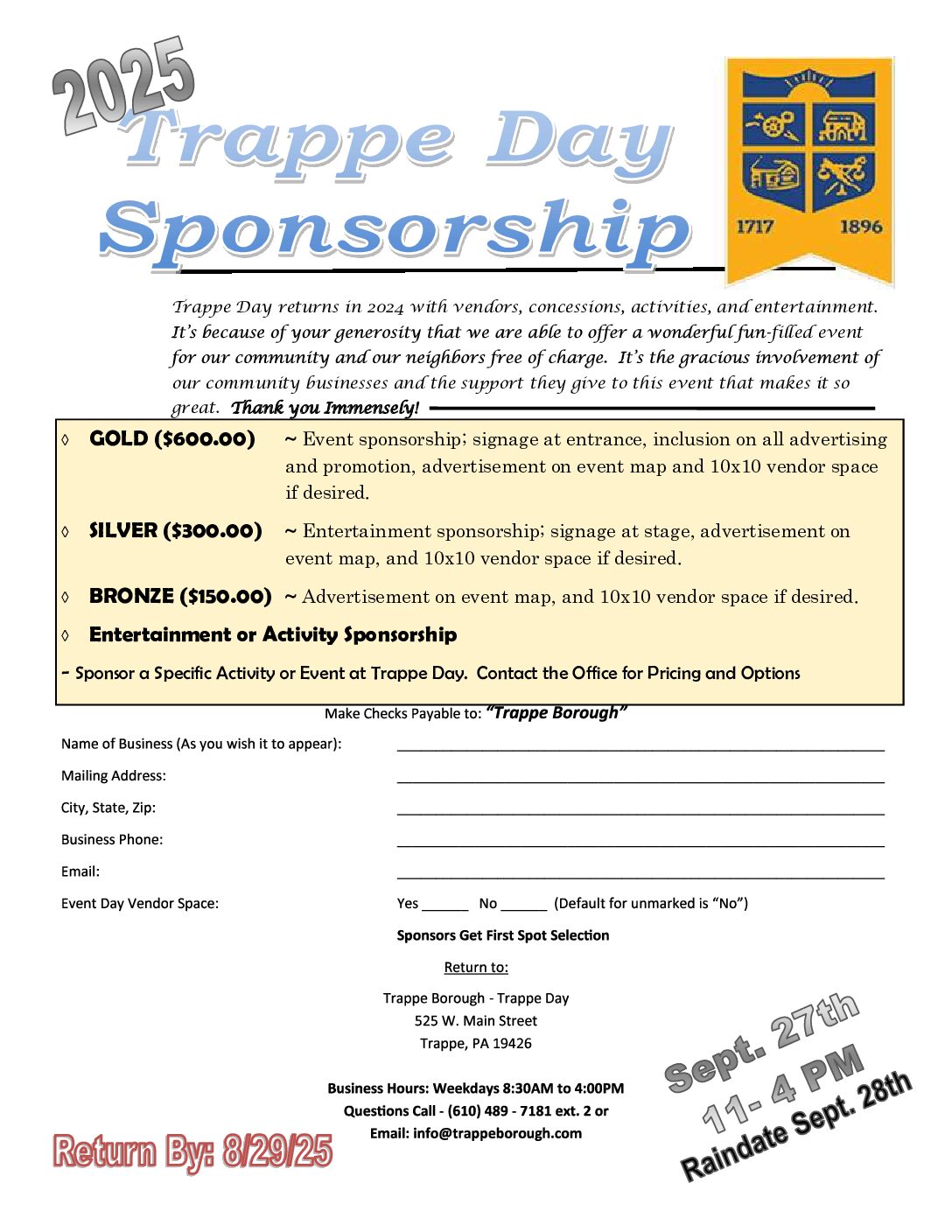 Click here for form: https://perkiomenvalleychamber.org/wp-content/uploads/trappeDay2025_sponsor-form.pdf